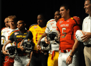 Whoa!! They look like a NASCAR pit crew in drag. I thought they might be clowns, except the funny colored shoes weren’t big and floppy. Maybe they were still in costume from a school play in which they were knights of the square table. Every list of the worst school uniforms year after year has Oregon on top, but Maryland leaps way, way over to claim the new numero uno in badness. If I were the NCAA, I’d investigate the Terps, because I can’t believe anybody would put that crap on his body if he wasn’t being paid. Oregon will have to go some to reclaim their spot, but Phil Knight will probably do it.