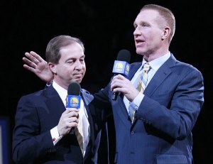 Warriors owner Joe Lacob (left) with Chris Mullin at the halftime jersey retirement ceremony Monday night at Oracle Arena.
